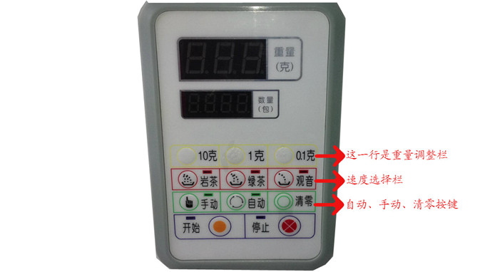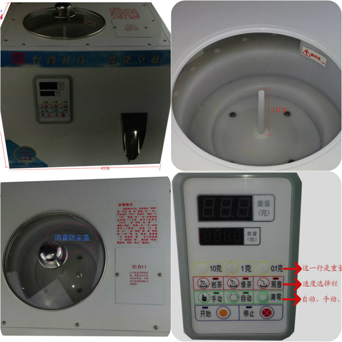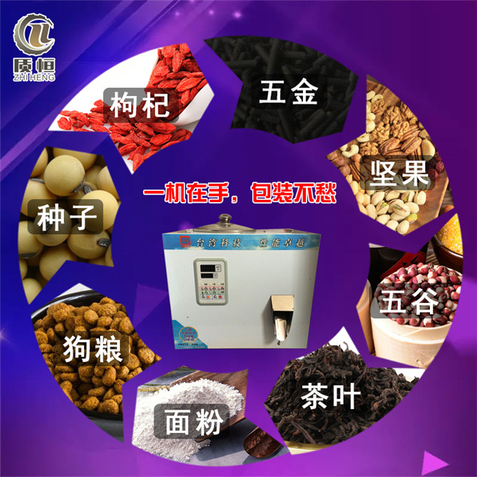 定量分装茶叶(铁观音、绿茶、红茶、岩茶、荞麦、花茶、牛蒡等)、食品、粮食、种子、果品、微小零器件、化工医药品等非粘性颗粒状、粉末状、条状物料。